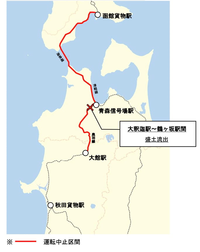 JR貨物の発表によると、12日正午時点で、津軽・海峡線の青森信号場・函館貨物間と、奥羽線の大館・青森信号場間で運転を中止している。この影響で、北海道発着貨物列車を中心に運休・大幅な遅延が発生している。