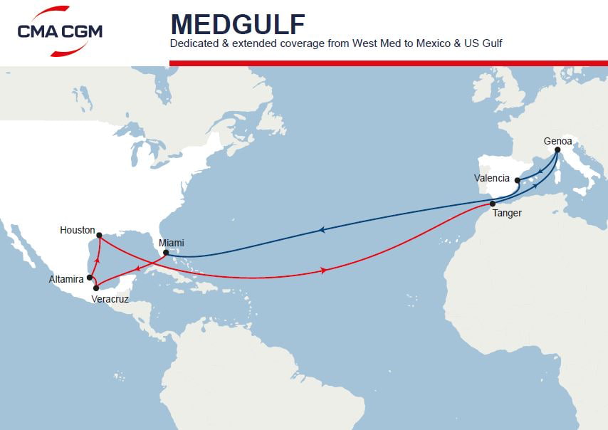 国際大手船社の仏CMA CGMは、西地中海とメキシコ湾岸エリアをつなぐ新たな「メッドガルフサービス」を9月末から開始すると発表した。29日にジェノヴァを出港する船舶からスタート。6隻の船舶がタンジェ、ジェノヴァ、バレンシア、マイアミ、ベラクルス、アルタミラ、ヒューストン、タンジェの順で寄港する。