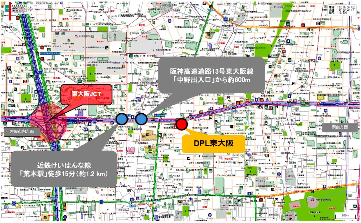 大阪市内へのアクセスに優れた北・中河内地域に立地し、阪神高速道路13号東大阪線の中野出入口からは600メートル。近畿全域への輸送拠点としても機能を発揮できる。東大阪市は大阪、堺市に続いて人口が多く、テナント企業の雇用確保の面でも強みがあるとしている。
