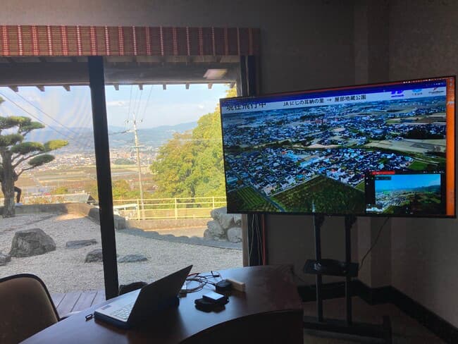 地権者に承諾を得たルートで、飛行下に第三者が侵入しないよう目視する人を配置した「レベル2」によるドローン飛行を実施。臨時に設置した「遠隔監視センター」からリアルタイムで、機体の位置や関連情報を配信してモニタリングした。