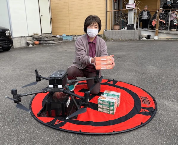 ▲ドローンによる防災食の運搬を実証(出所:トルビズオン)