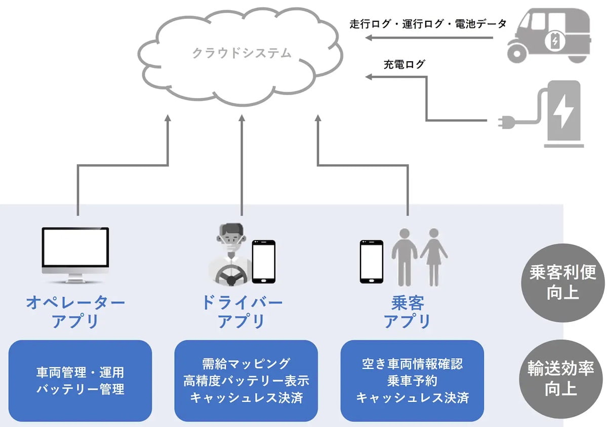 具体的には、オンデマンド運行管理や配車アルゴリズムなどの機能を実装したクラウドシステムを活用。Eモビリティーの車両や運行に係る情報をモバイル経由で取り込み、オペレーター(車両運用事業者)、ドライバー、乗客向けにアプリを介して各種機能を提供する。