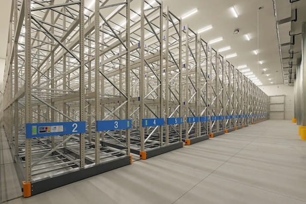新設されたのは迫田運送の南松永営業所で、冷凍・冷蔵倉庫が少ない福山・尾道エリアで事業拡大を図るという。庫内には最新の電動移動式棚を導入し、最大2064パレットの収納が可能。また、リモコンによるボタン操作で温度管理ができる仕様とした。