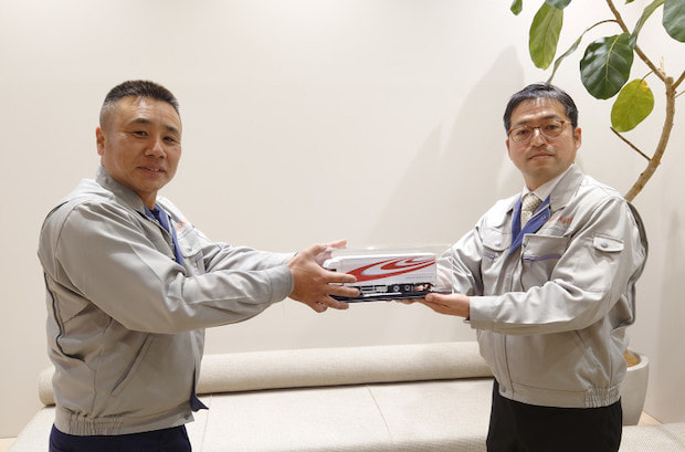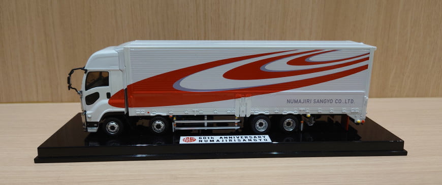 国内沼尻産業は3日、創業60周年事業の一環として同社オリジナルカラーを施したトラック模型を製作し、運輸部乗務員30人に贈呈した。デザインは赤(挑戦)、銀(団結)、白(誠実)の3色を基調とし「ひとの輪、ひとの和、ひろがる“わ”」の3つの「わ」への思いを込めた。