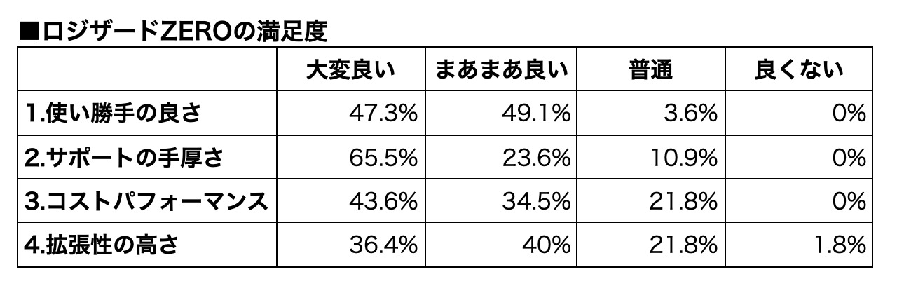 1位の「ロジザードZERO」は、「サポートの手厚さ」に対する満足度の「大変良い」が65.5%でトップとなった。特長の1つである顧客対応の充実ぶりが支持されているようだ。今回の調査でもユーザーからサポートを評価する声が多かった。