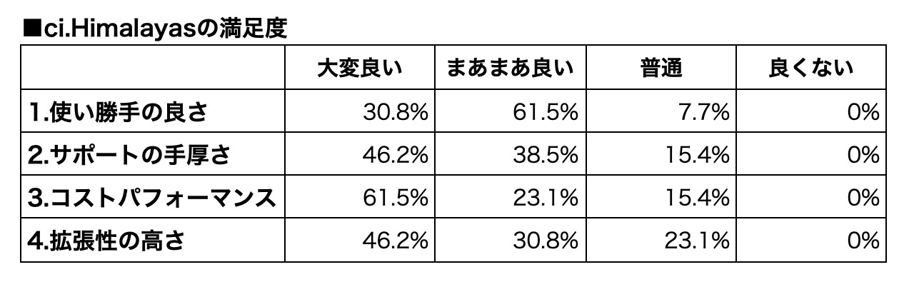 2位の「ci.Himalayas」は、「コストパフォーマンス」の「大変良い」が61.5%と機能と価格とのバランスのよさが評価された。また、ユーザーからは「提案をいろいろとしてくれ助かる」(運輸会社)との声があった。