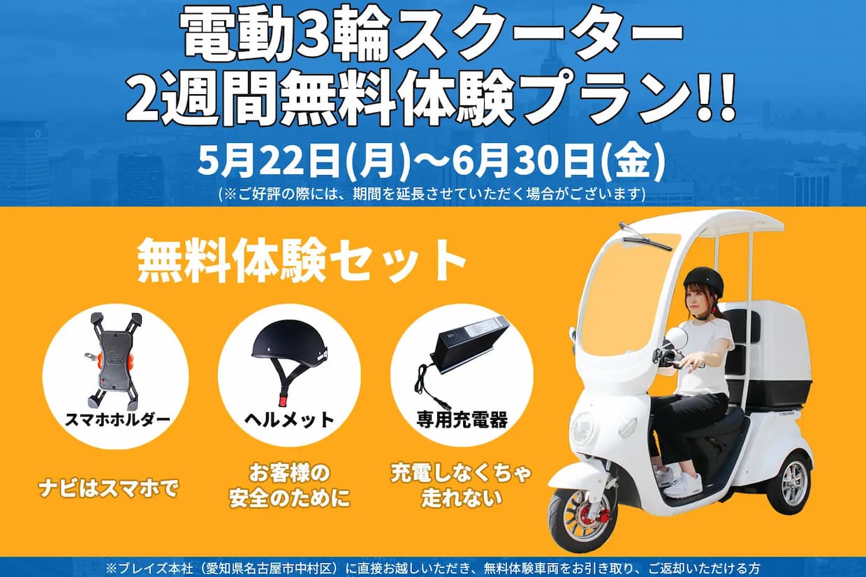 ロジスティクスEV(電気自動車)メーカーのブレイズ(名古屋市中村区)は22日、電動(EV)3輪バイク「EVデリバリー」を、無料で2週間体験できる特別プラン「電動3輪スクーター 2週間無料体験プラン」を開始したと発表した。