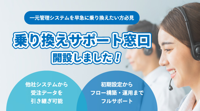 「乗り換えサポート窓口」は、次の2つの要素を中心にサポートを提供する。一つ目は、システムの初期設定からフロー構築、運用開始までを専任のスタッフが全面的にサポートすること。システムに対する不安を抱える事業者でも安心して利用することができる。さらに、電話、メール、チャットなどを通じた直通のサポート体制も確立している。二つ目は、他社システムから「GoQSystem」への過去の受注データの取り込み対応だ。多なデータ形式に対応しており、事業者のニーズに合わせたカスタマイズも可能としている。