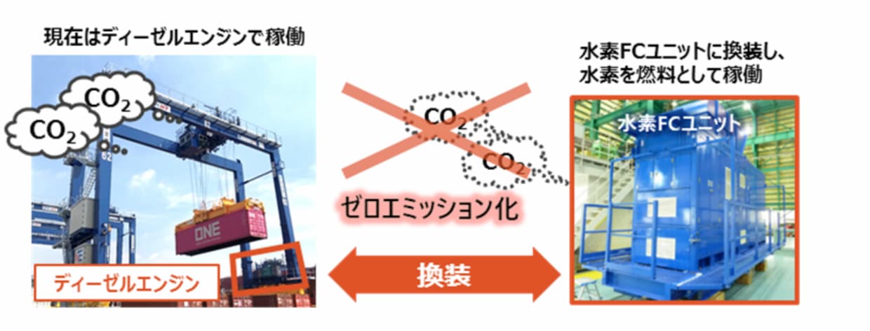 ことし中に事前調査や計画、FC発電装置などの設計・製作などを行い、2024年からはFC発電装置への換装や水素燃料での荷役の実証を行う。