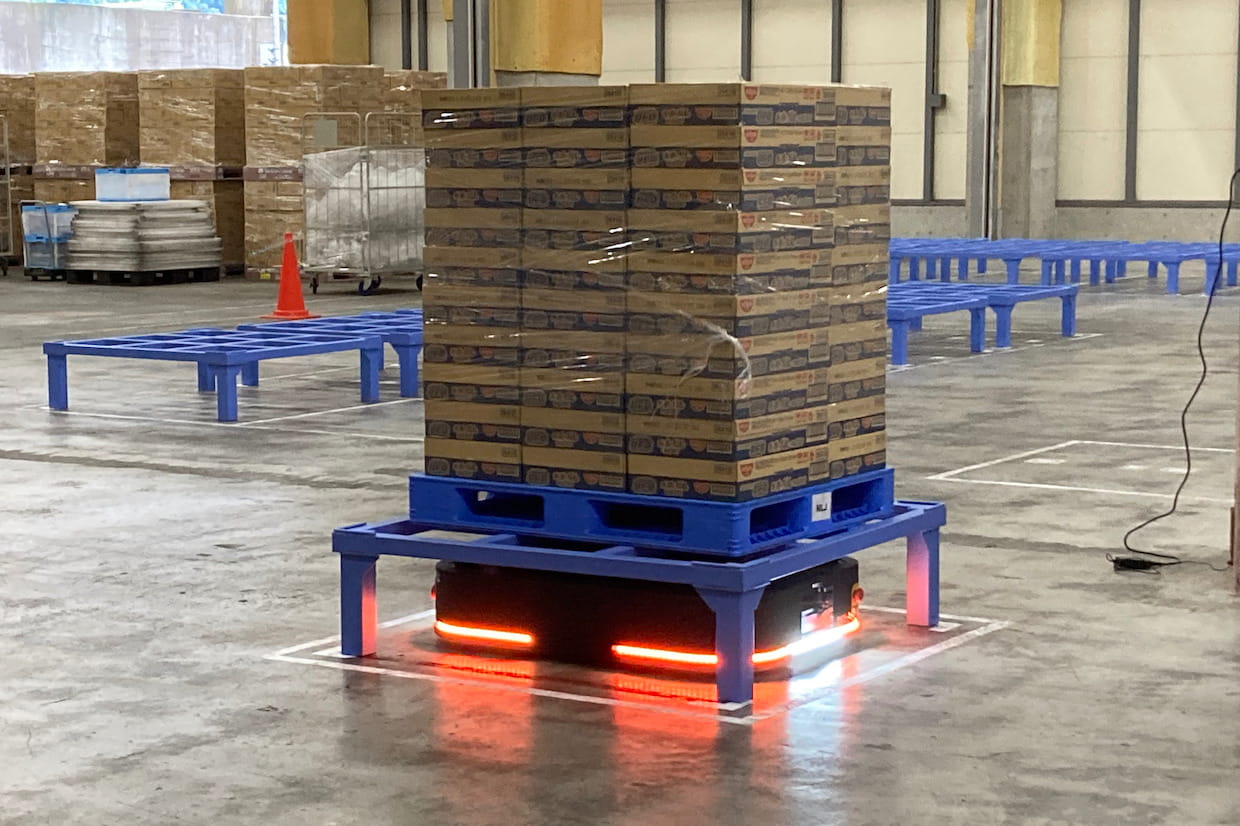 ▲パレットへの積み付けが完了。今度はAMRが指定の場所まで荷物を自動搬送する