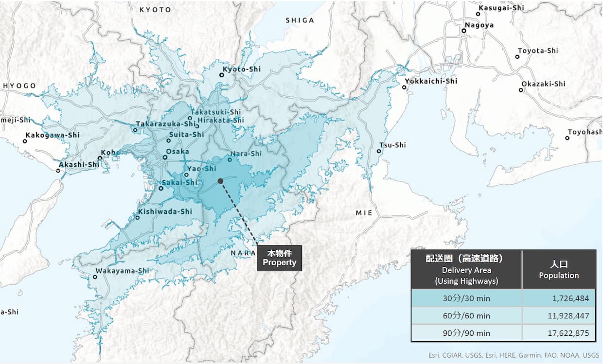さらに、物流施設における入居テナント探索に欠かせないのが、周辺人口の分布である。「奈良県は大阪のベッドタウンであり、県外へ勤めている人の割合が多い日本屈指の県です。そのため、労働人口は多く顕在していると想像できます。また、同エリア初となる大規模なマルチテナント型物流施設を通じて新規雇用の創出にも貢献できる社会的意義があると考えました。」(資産運用部の小野晋シニアマネージャー)