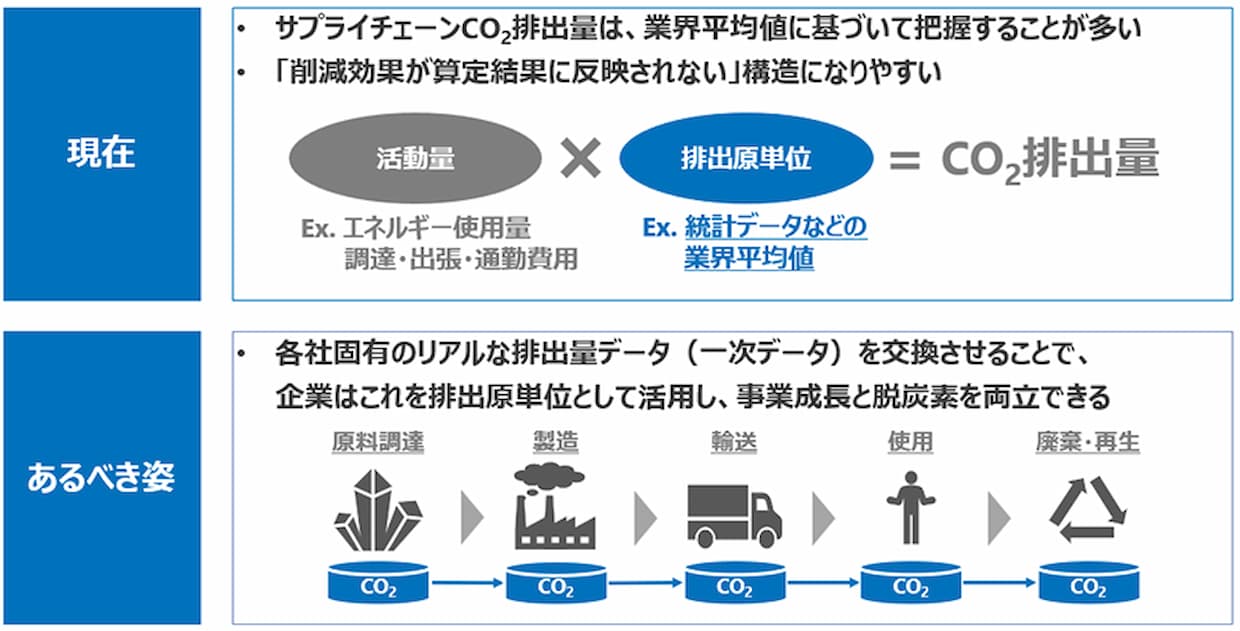 NTTデータグループによると、企業はサプライチェーン全体でCO2排出量の削減を求められているが、事業成長と脱炭素を両立させるには各社固有の1次データを用いてCO2排出量を把握することが必要で、これを実現するにはCO2排出量の算定ルールやCO2排出量データの交換に関する技術仕様などの標準化が必要であるとしている。