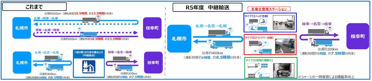 道北と札幌圏を結ぶ物流輸送では往復13時間以上を要することから、高規格道路直結の名寄管理ステーションでヘッド交換やドライバー交換、荷物積み替えを行う中継輸送と、降雪期での中継輸送やシャーシの一時保管、ヤマト運輸名寄営業所での大型荷物積み替えなどの実証実験を行い、ドライバーの労働時間や輸送費用、高規格道路の有効性、降雪期の課題などを検証する。