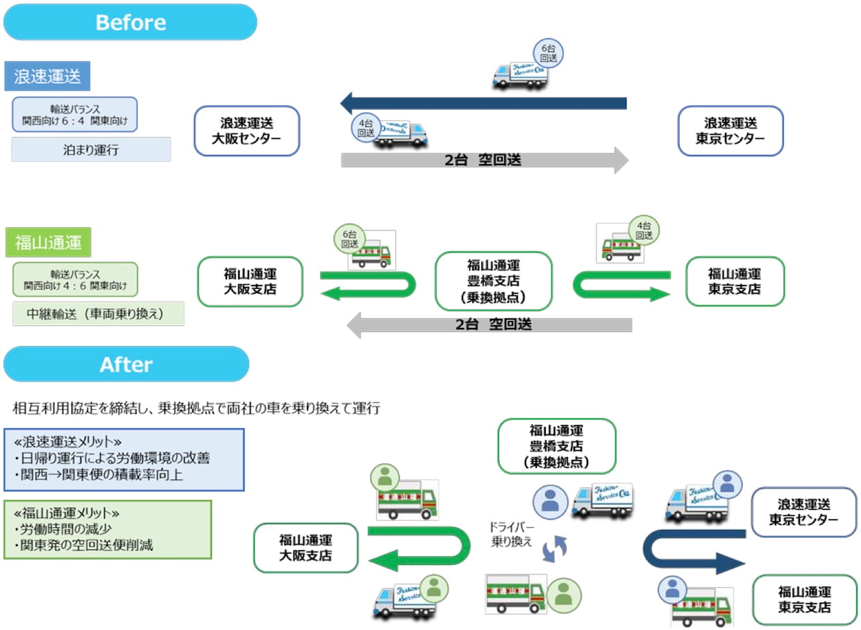 両社の共同輸送により、関東向けと関西向けの不均衡を解消するとともに、車両の相互利用で連携することで、福通の中継輸送スキームを共同で行うことが可能となった。これにより、従来の浪速運送の泊まり運行が日帰り運行となるなど、ドライバーの時間外労働規制にも対応する。