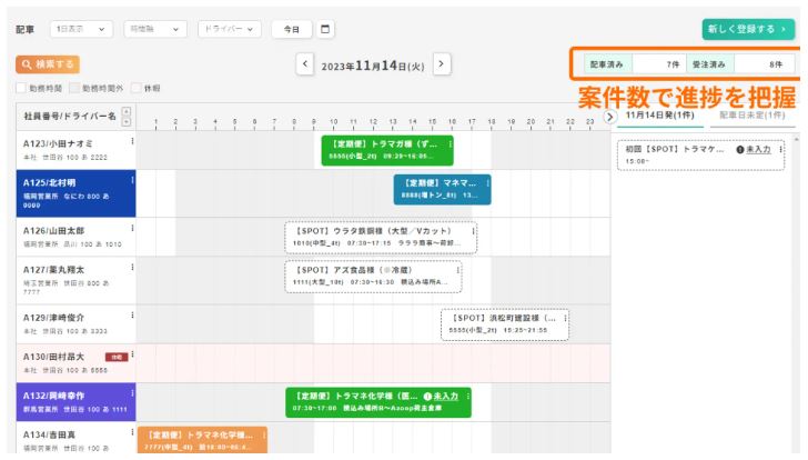 加えて、配車表上で配車済み・受注済みの案件数表示を追加することで、配車担当者の配車ミス低減に寄与。案件をマウスで移動するだけで、車両・ドライバーの割り当て変更や開始・終了日時を調整できる。