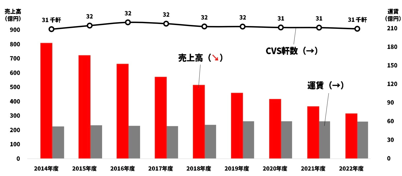 同社はローソン、ファミリーマートなどへのコンビニ店舗向け配送で採算が取れないことから、25年2月をめどに同事業から撤退し、業務を徐々にトーハン(新宿区)に移行する。撤退の理由は、コンビニ店舗向け配送の恒常的な赤字構造にある。同社がまとめたここ10年ほどの配送店舗数と運賃、売上高の推移を見ると、22年度の配送店舗数は14年度比で変わらず、運賃が微増なのに対し、売上高は810億円から317億円と6割以上も減少している。同社の予測では、22年度で32億円を計上した営業損失は、25年度には50億円を超えるとしている。