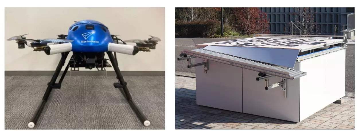 ▲(左から)実証で使用するドローン、ドローンポート(出所:日本調剤)