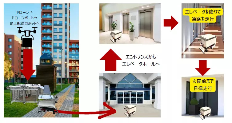 今回の実証実験では、ドローンをマンション付近まで飛行させ、積載した解熱剤や咳止めなどの医薬品を想定した荷物をドローンポートを介して地上配送ロボットに受け渡して、エレベーターを経て玄関前まで配送する。