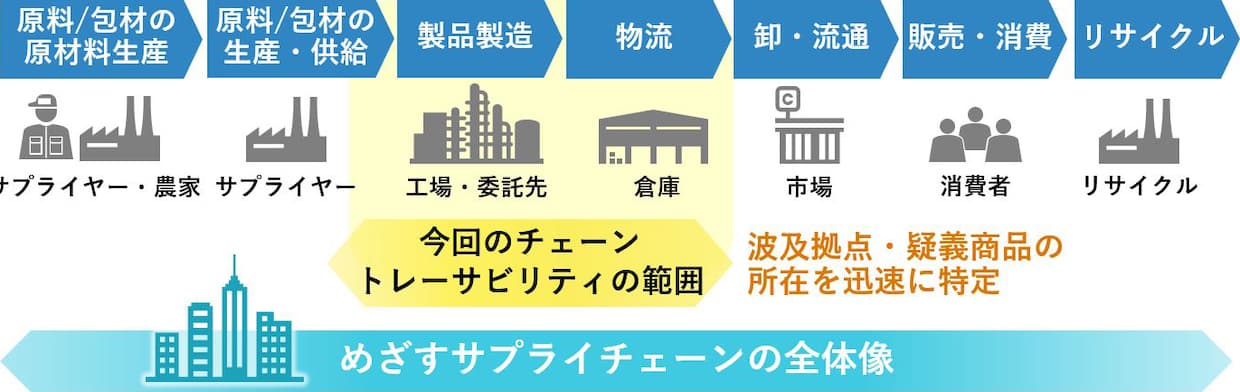 従来は、これらのサプライチェーン情報は個別のシステムで管理していたため、商品や原料に疑義が発生した場合には調査と確認に時間と労力を要していたが、新システムにより即座に影響範囲の把握が可能となった。