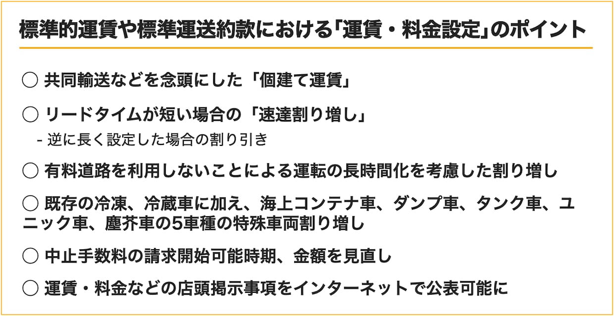 今回の標準的な運賃では、運賃を平均8%値上げした運賃表に改定される。また標準的運賃においては運送と運送以外の業務を別建てで、荷主から適正な対価を収受することや、荷役作業ごとの「積込料・取卸料」の加算、荷待ち・荷役時間が2時間を超えた場合の割増率5割加算、運賃をトラック車両ごとではなく荷物1個あたりの「個建て」にすることでの共同輸送の促進や、リードタイムが短い運送での「速達割増し」や、高速道路の積極利用を促す。政府の中長期計画では運賃の8%値上げに、こうした別建ての対価収受を加算することで、初年度で10%の賃上げとしての成果を挙げることを目標として明示した。