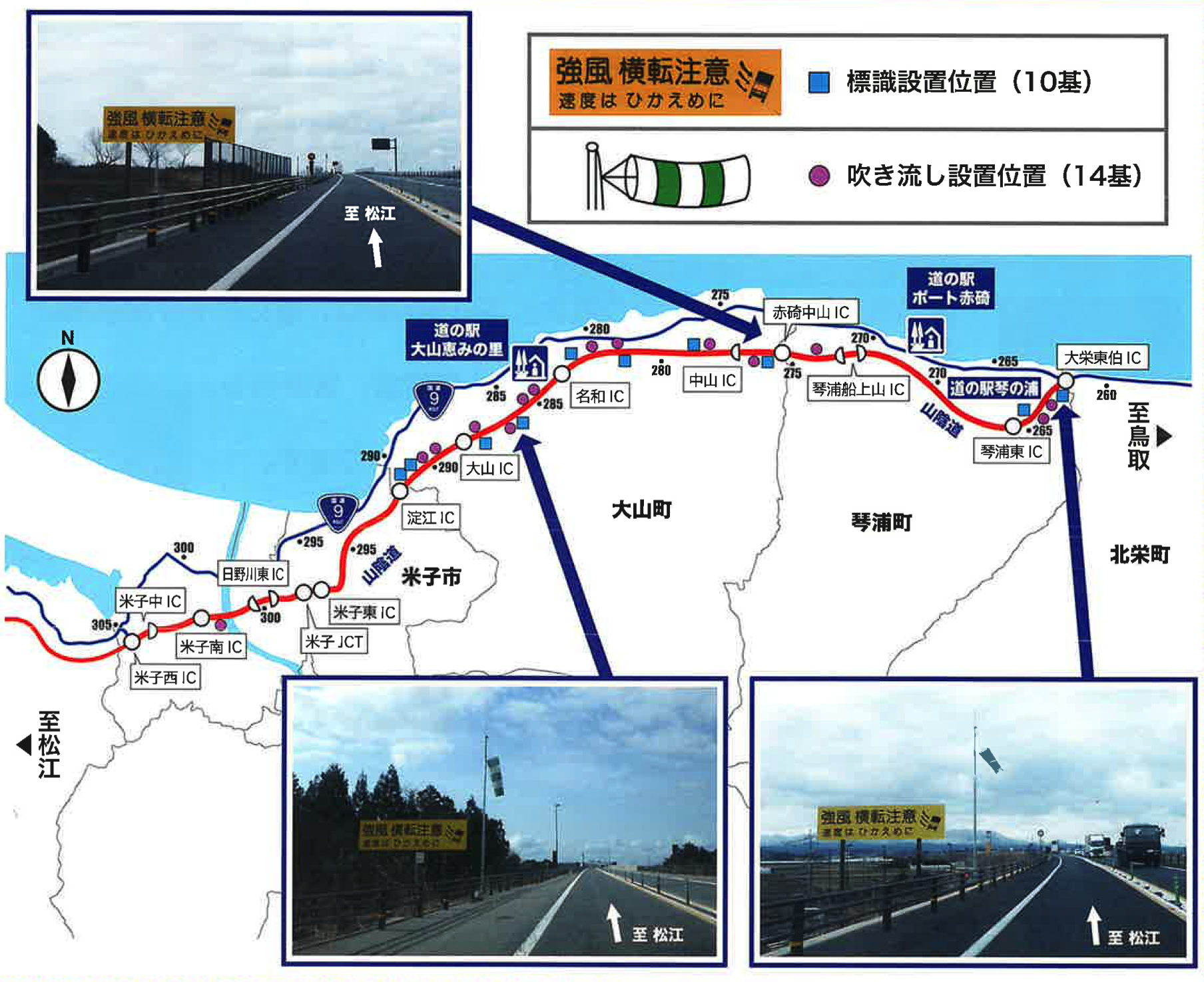 山陰道では、大山周辺で吹き付ける「大山おろし風」と思われる強風が発生し、2012年4月に大山IC周辺や大栄東伯IC付近で6台、16年4月に琴浦東IC付近で1台のトラック横転事故が起きた。