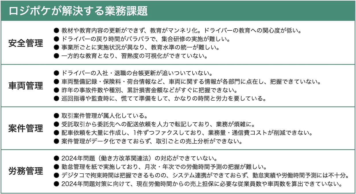 X Mileのロジポケは、運送業のバックオフィス全般をDX(デジタルトランスフォーメーション)によって効率化できるクラウドサービス。運送業務については「受注から案件管理、請求書発行まで一貫してコントロールできる」(安藤氏、以下同)ので、取引の可視化や請求漏れなどのミスを減らすことができる。また、勤怠管理、点呼、運行管理、運転者台帳など、労務と運行に関わるデータをまとめて記録、保管することができるため、ドライバーの稼働状況や勤務の間隔なども把握しやすい。