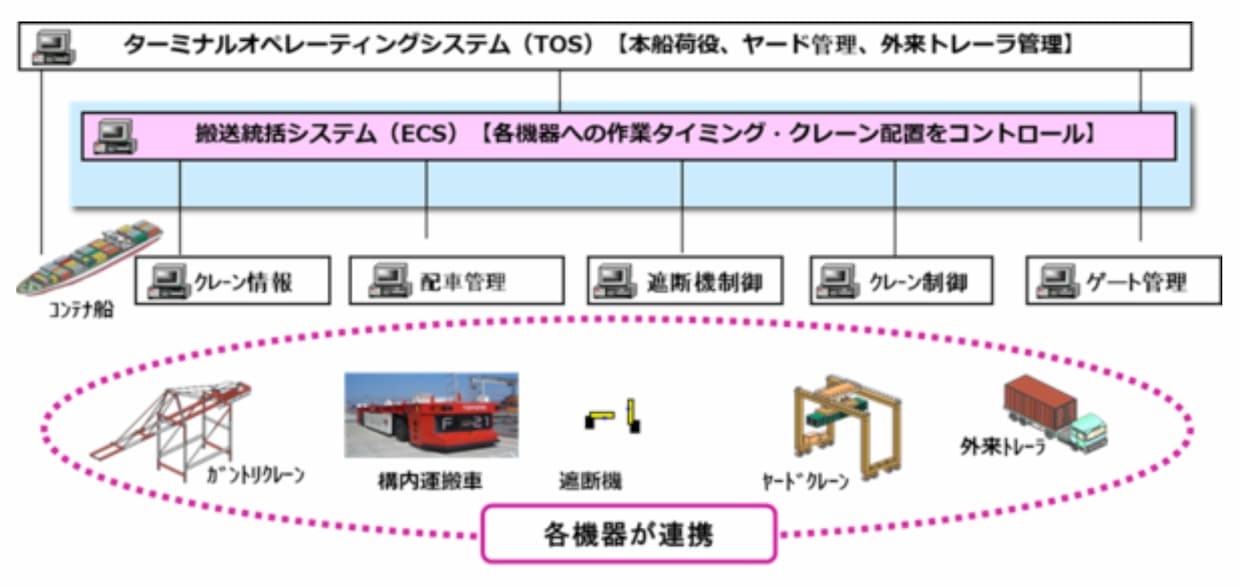 今回、採択されたのは、ガントリークレーンが作業するコンテナ1本ごとのサイクルタイムを把握したうえで、ターミナル内の荷役機器や構内搬送車、ヤードクレーンなどターミナル内の荷役機器の作業指示を一括して行うシステムで、搬送統括システム(ECS)と名付けた。