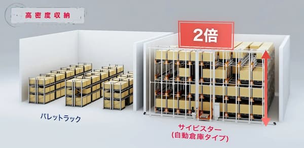 荷物の取り違えや落下による破損などの人的エラーの削減や、前後工程と合わせた自動化で製造ラインとの直結が可能となり、効率向上や24時間稼働のニーズに対応する。また、フォークリフトが届かない高所までパレットを運んで格納できるため、高密度保管が可能。ロット単位で保管物を管理する現場や、食品・飲料品、日用品、原材料など少品種大量保管の業種・業態に有効だ。