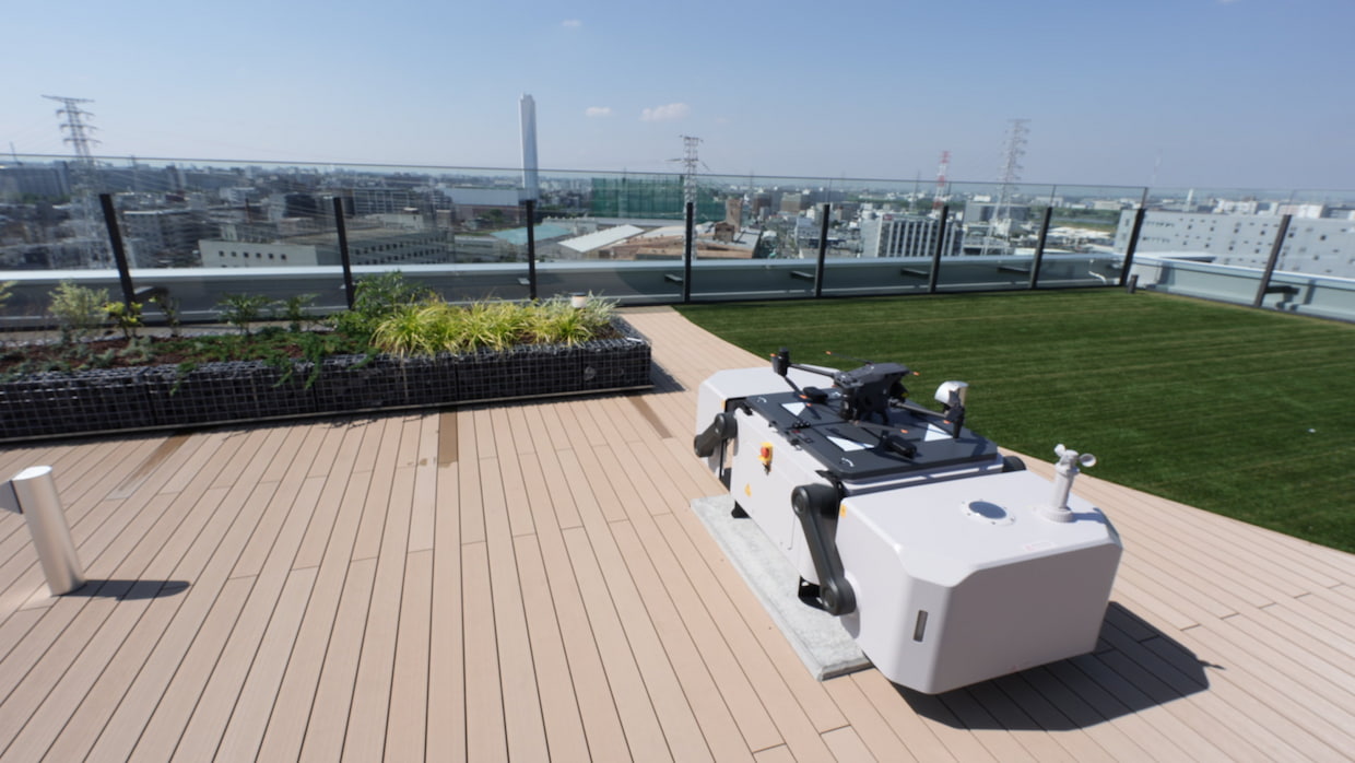 「MFLP・LOGIFRONT東京板橋」屋上のドローン離発着場。太陽光パネル点検や災害時物資発送などに活用する。また屋上だけでなく敷地内駐車場では利用者が持参したドローンポートを設置することもできる。