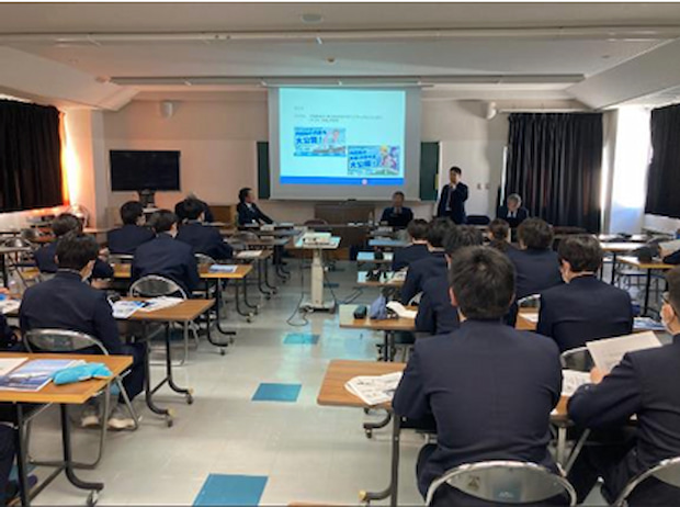 講座では、関東運輸局の成瀬海事振興部次長が、船員の働き方改革による労働環境の改善や給与の上昇について講義を行った。続いて、栗林マリタイムの平野二等航海士が、実際に乗船していたRORO船の船内作業や生活、休暇制度について講演し、生徒や教員の関心を集めた。