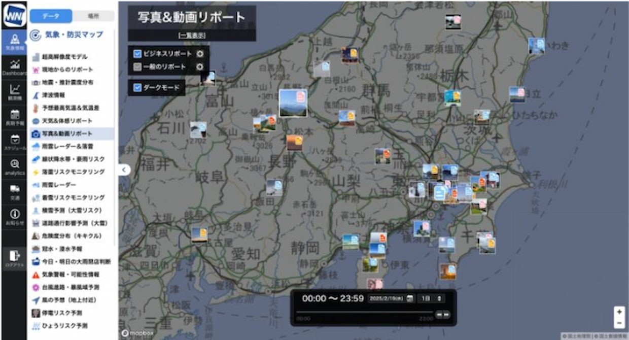 さらに、「ウェザーニュース for business」では台風やゲリラ雷雨、積雪、河川水位などの気象情報も確認できる。パソコン版の専用ウェブサイトでは、数か所から数千か所の拠点の気象リスクをマップ上で重ね合わせて表示可能となり、拠点のリスクを網羅的に把握できる。