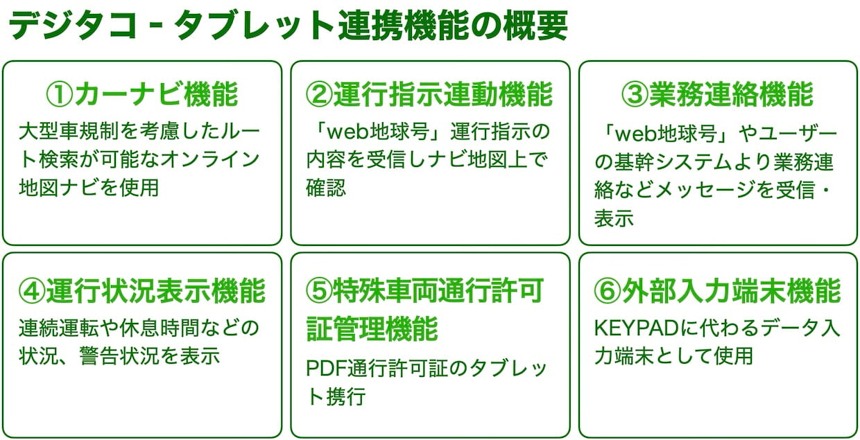 また、ナビ機能などもタブレットを通じて提供でき、今後増加が予想される外国人ドライバーなどへの運行指示に活用するなど、将来的な機能の拡張が可能。多様な人材活用や社会情勢の変化にも、タブレットを介して柔軟に機能拡張することができる。
