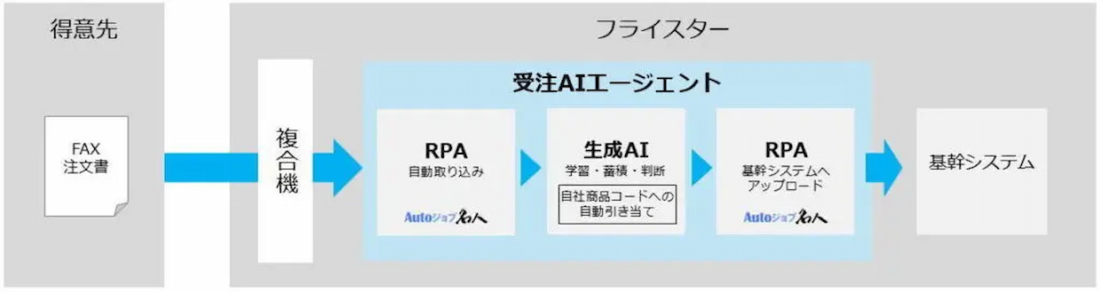 調査・データユーザックシステム(大阪市中央区)は24日、パン粉メーカーのフライスター(横浜市港北区)と共同で進めた受注業務自動化の実証実験で、93.6%以上の精度を達成したと発表した。AI(人工知能)エージェントとRPAを組み合わせた「受注AIエージェント」を活用し、ファクスによる注文書処理から基幹システムへの連携までを自動化した。