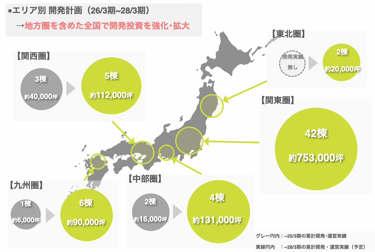エリア開発では、首都圏中心の開発だけではなく、中部圏ではこれまでの2棟から4棟に、関西圏では3棟から5棟に、九州エリアでは1棟から6棟へと積極開発を表明。各地域の主要エリアごとに最適な拠点を再配置して、食品を含む地域産業の活性化や、全国展開における地域ごとの最終拠点としての役割を担う姿勢である。