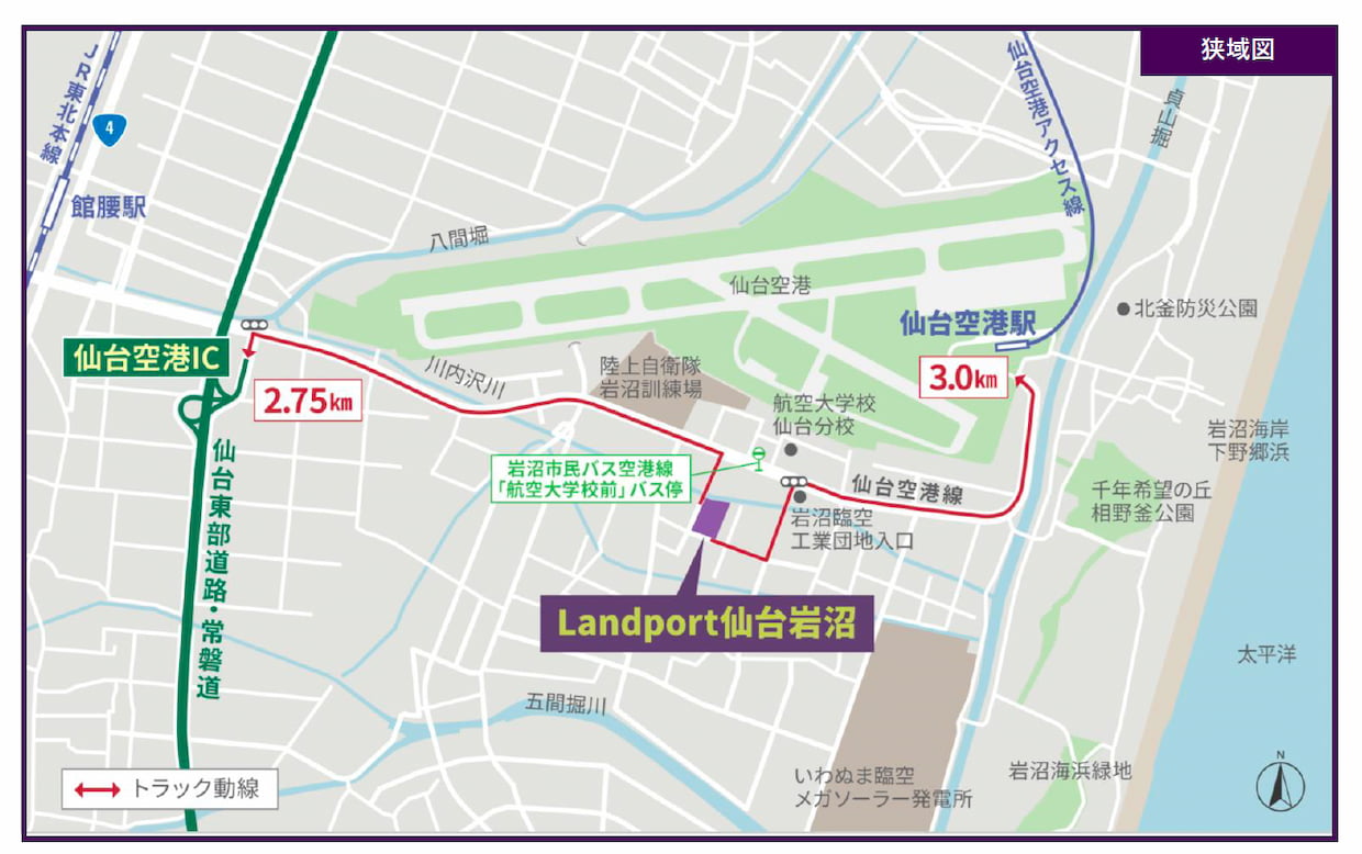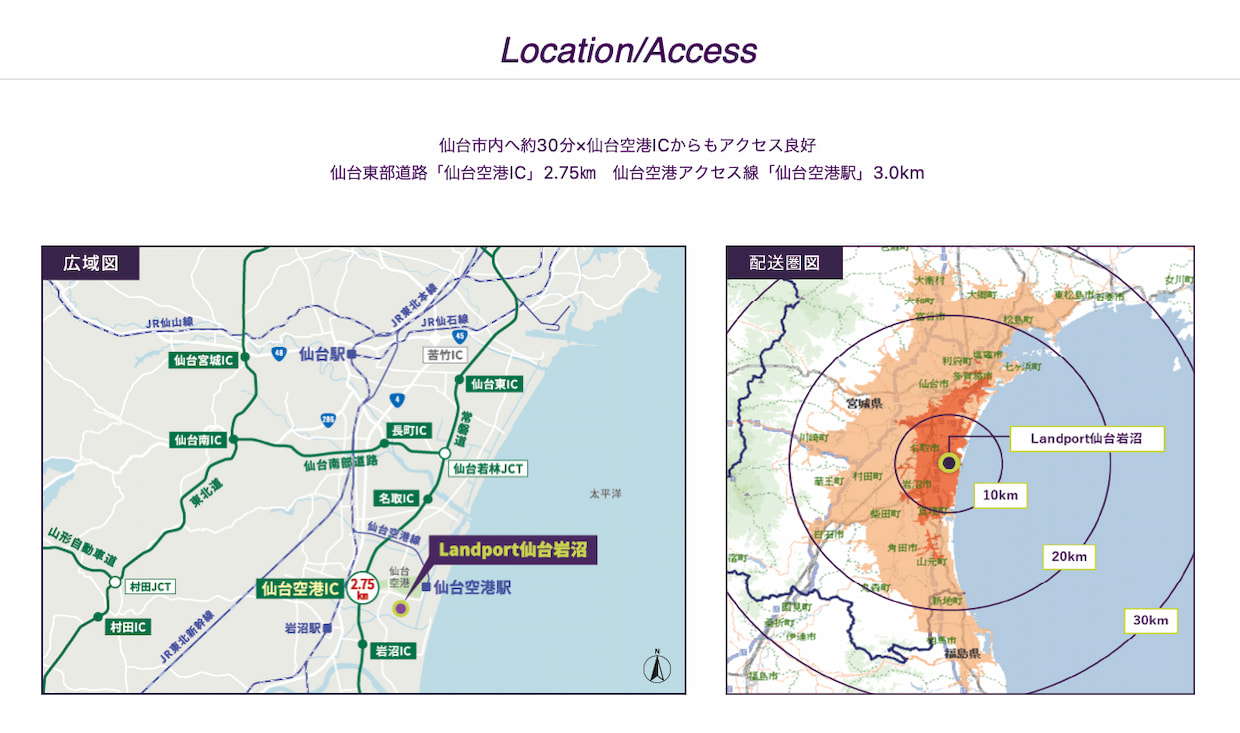 同施設が立地するのは、仙台空港至近の岩沼臨空工業団地内。岩沼市が地域の製造業や物流機能が集積するエリアとして整備した地域産業活性化の中核エリアに位置する。仙台東部道路・仙台空港インターチェンジ(IC)まで2.75km、さらに国道4号への接続の利便性も高く、仙台市内まで20km、30分程度でアクセスできる物流拠点となる。「東北の中心地、仙台市をターゲットとしたラストワンマイル配送においては格好の立地で、1日あたり複数回の往復も可能。今後も拡大が予想される仙台市内への配送需要をカバーする施設として、まだまだ絶対数が不足している賃貸施設による物流再編を実現する」と篠氏は語る。