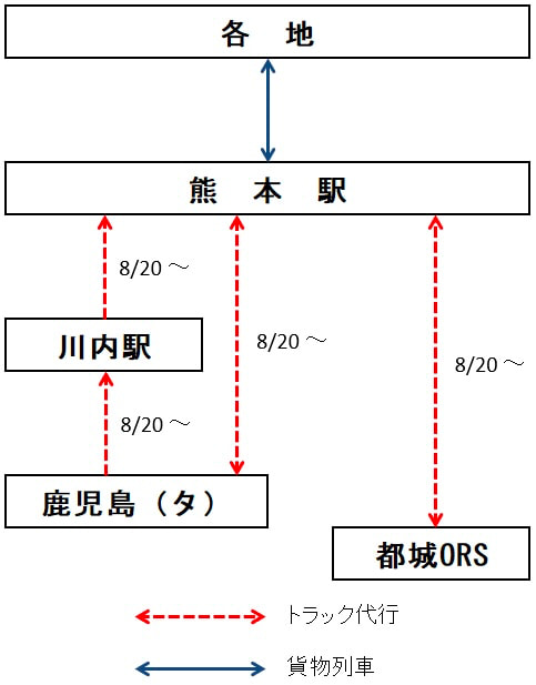 国内九州地方で続いた大雨の影響により、貨物列車の運行に支障が出ている。日本貨物鉄道(JR貨物)が18日20時に発表したところによると、鹿児島線は運転を再開したものの、肥薩おれんじ鉄道・八代駅-肥後田浦駅間で土砂の流入・流出が確認され、同区間を含む一部区間で運転を見合わせている。これに伴い、八代駅-鹿児島貨物ターミナル駅間を走行する貨物列車が運休している。
