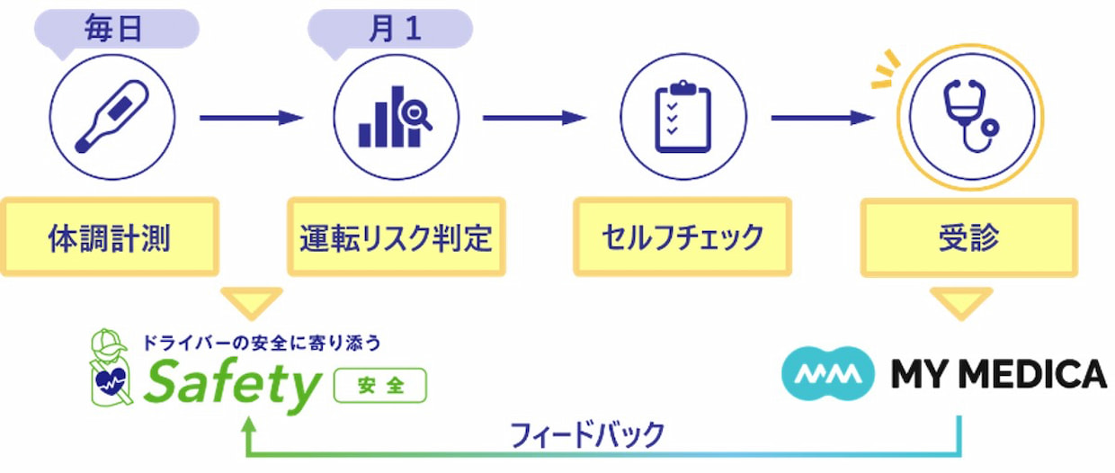 今回の連携により、SSCV-Safetyで健康リスクが高いと判定されたドライバーが、オンライン診療をスムーズに受けられる仕組みを構築する。さらに両社のシステムを連携させ、バイタルデータと治療状況を統合管理することで、体調確認や健康支援の精度向上を目指す。