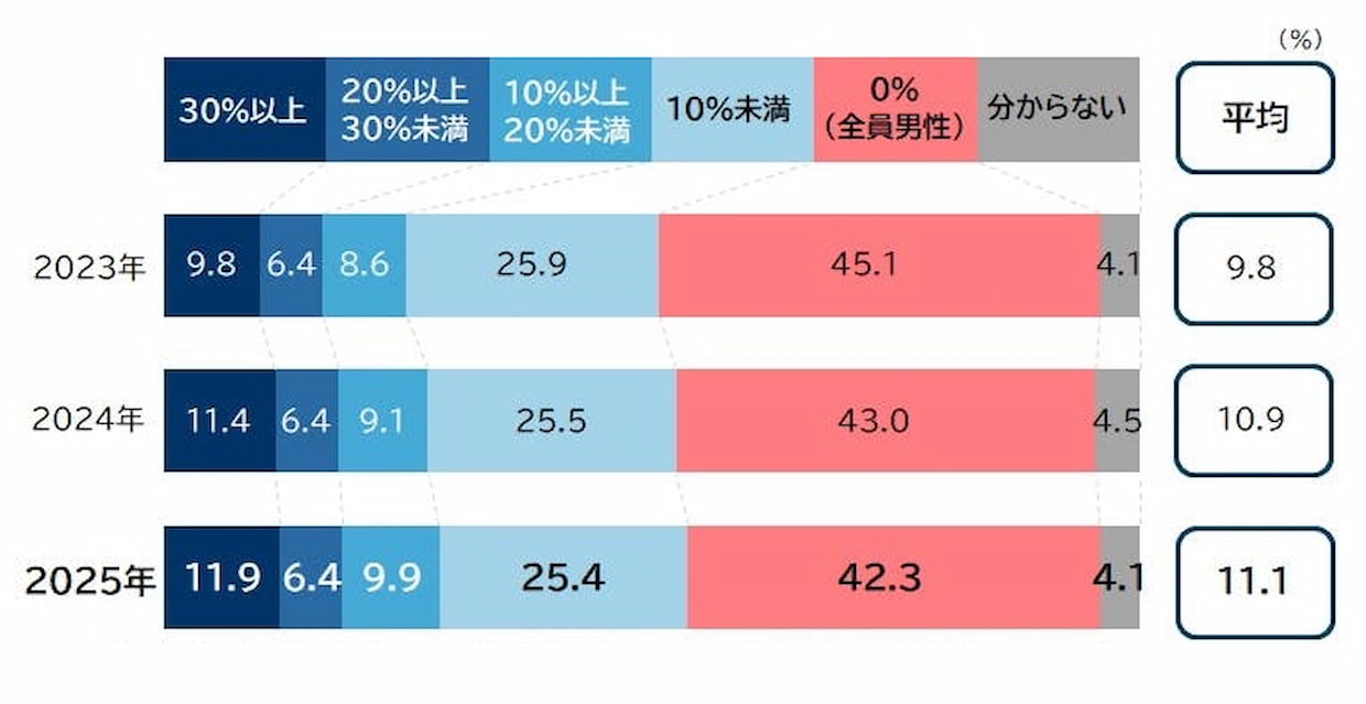 自社の管理職(課長相当職以上)に占める女性の割合を尋ねたところ、「30%以上」が11.9%、「20%以上30%未満」が6.4%、「10%以上20%未満」が9.9%、「10%未満」が25.4%だった。また管理職が全員男性である企業は42.3%と前年から0.7ポイント低下したものの全項目のうち最も高かった。一方、政府目標の「30%程度」を達成している企業の割合は前年から0.5ポイント上昇し、調査を開始した2013年以降最高を更新した。