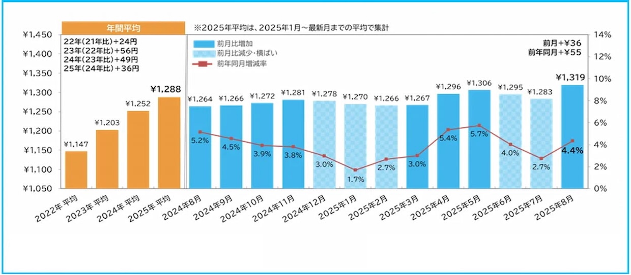 調査・データマイナビ(東京都千代田区)は17日、8月の「アルバイト・パート平均時給レポート」を公表した。全国の平均時給は1319円で、調査開始以降最高額を更新。前年同月から100円以上大幅増額した職種もあった。「配送・引越・ドライバー」は1402円で、前月に比べ59円の増、前年同期比では101円の増だった。