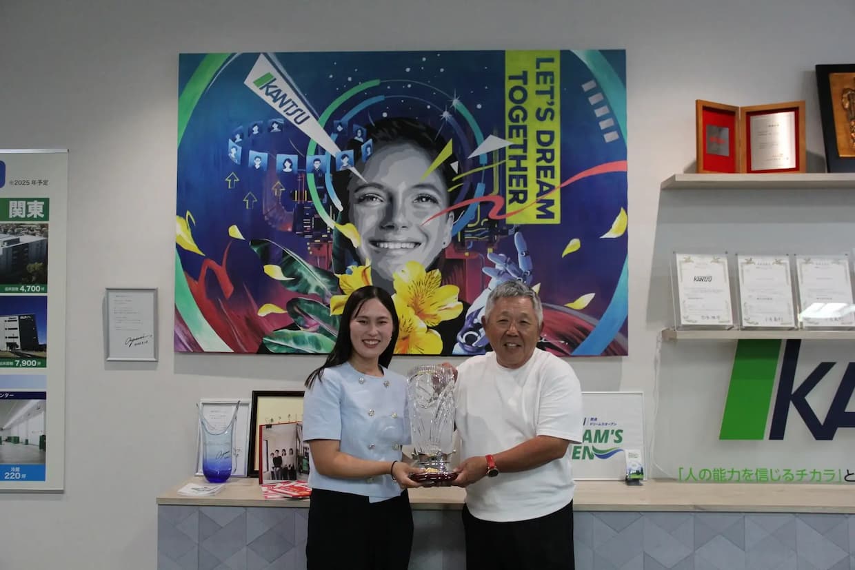 ▲皆吉愛寿香選手が関通を訪問し、初優勝のトロフィーを手に記念撮影(出所:関通)