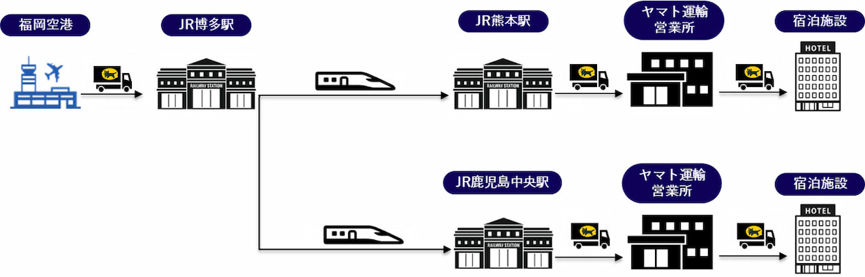 荷物は福岡空港の宅急便カウンターで受付後、ヤマト運輸がトラックでJR博多駅へ輸送。新幹線に積み替えてJR熊本駅・鹿児島中央駅へ運び、到着後に再びトラック輸送を行い、18時以降に対象宿泊施設へ届ける。受付は7時30分から11時までで、料金は宅急便運賃に2200円(税込)を加算する。