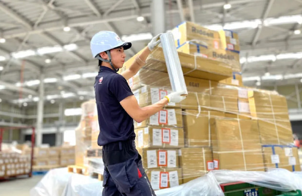 ▲ストレッチフィルムを使用した作業の様子(出所:三井化学)