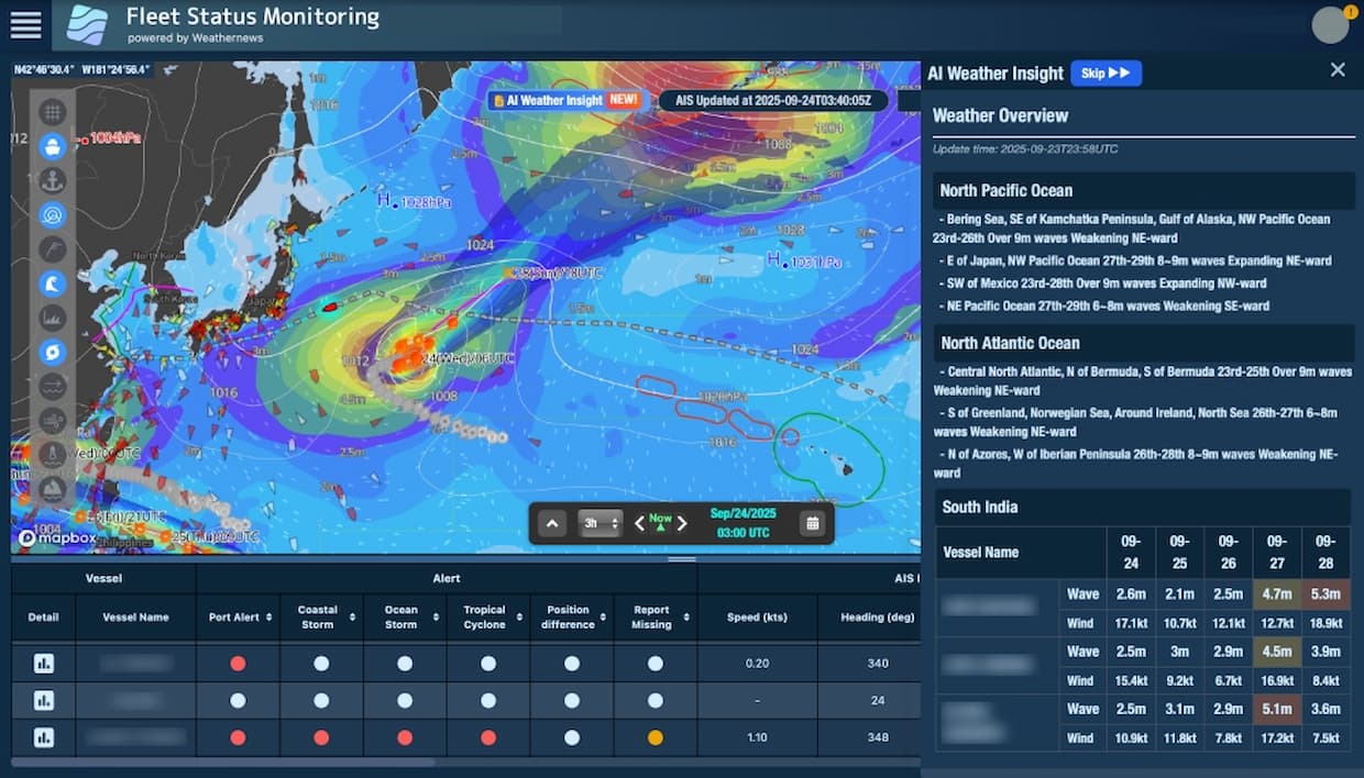 新機能のAI Weather Insightは、AIを用いて5日先までの全世界の海域における気象・海象見解をテキストや表で自動生成。利用者は熱帯低気圧の発生確率などを考慮に入れた最新の概況文をいつでも入手できる。また、利用者の船舶の最新位置情報と航路情報をもとに、AIが荒天の影響期間や遭遇状況を自動分析し、利用者は荒天の影響を受ける船を瞬時に把握できる。