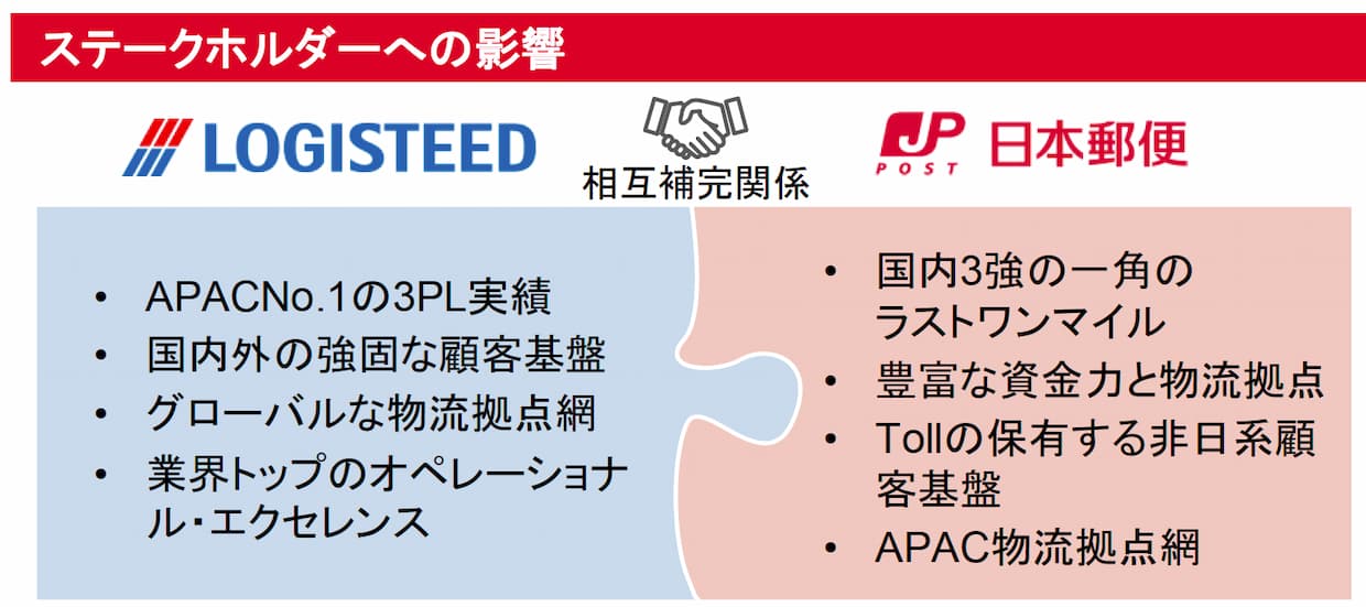 説明会で登壇した日本郵便の行木司常務執行役員は、「日本郵便は郵便・宅配を中心に事業を展開してきたが、成長分野であるコントラクトロジスティクス(3PL)が空白地帯だった」と指摘。ロジスティードの持つ国内外の顧客基盤と倉庫オペレーション力を取り込むことで、「国際物流からラストワンマイルまでを地続きで結ぶ物流サプライチェーンを構築する」と述べた。