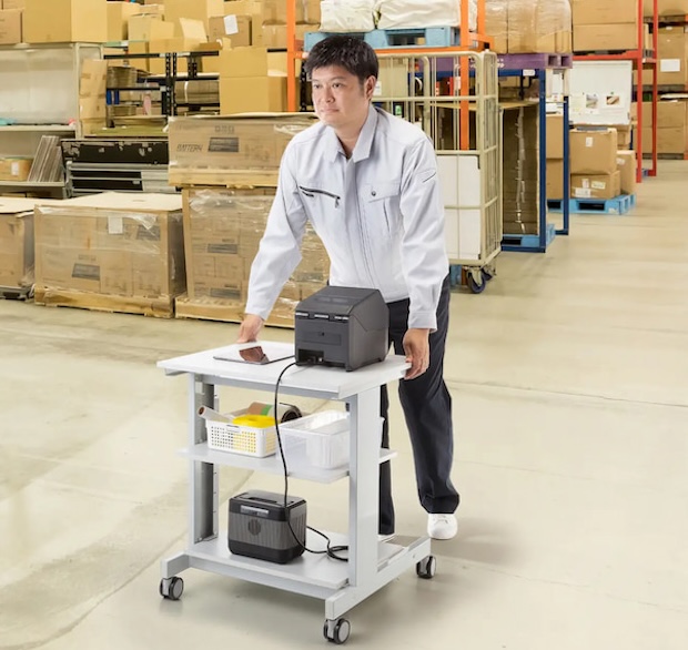 新製品は立ち作業に適した高さ100センチタイプと、デスクと並べて使用できる高さ70センチタイプの2種を展開。天板サイズは幅600×奥行き500ミリで、ラベルプリンターやノートパソコンなどを搭載できる。中棚は工具不要で位置調整が可能。キャスターにはPタイル床でも滑らかに走行できるナイロン製を採用した。