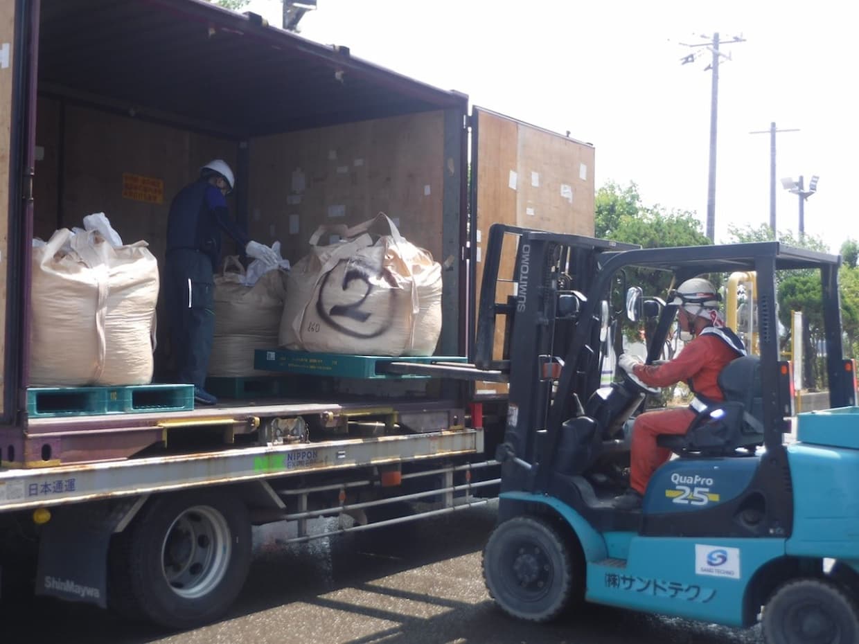 ▲再生路盤材を詰めたフレコンバッグをコンテナに積み込む様子(出所:サンドテクノ)