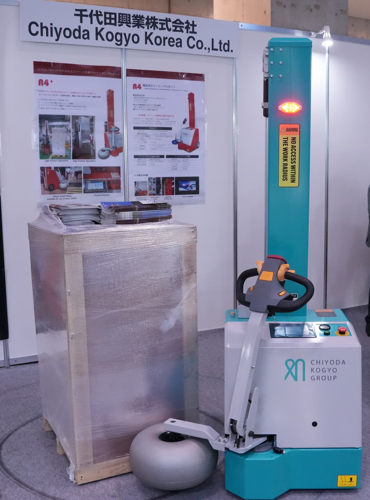 R4 PLUSは、韓国メーカー・ミョンシンのモデルを千代田興業が国内販売する自走式のストレッチ包装機。進行方向に設けられた4つのセンサー(人感1基・赤外線3基)によって周囲の状況を検知し、巻き上げ対象の周囲を自動走行しながらフィルムを巻き付ける。