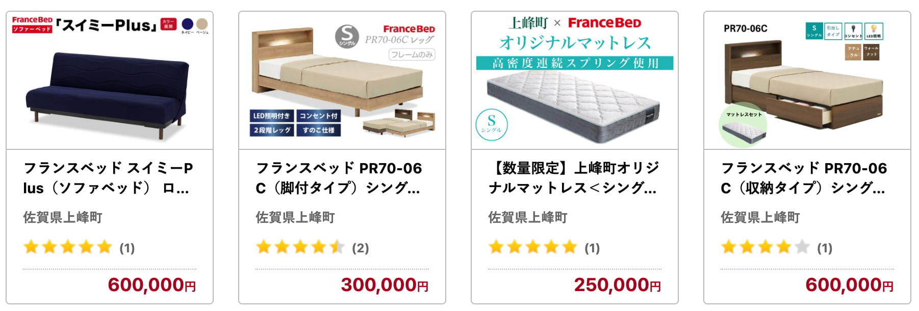 ▲佐賀県上峰町へのふるさと納税でもらえる返礼品にはフランスベッド製品が名を連ねる(出所:ふるなび)