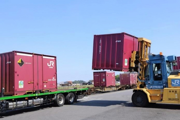▲貨物ターミナル駅で貨物列車からトラックに鉄道コンテナを積み替え (出所:日本貨物鉄道鉄道)
