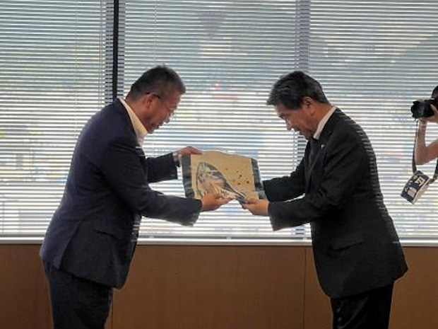 贈呈式は2日に焼津市役所で開催され、市長の中野弘道氏の立ち会いのもと、同社からは田島通利専務取締役、大庭康広執行役員が出席した。